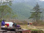 リュウキンカの木道の先 弥四郎小屋が見えてきた