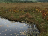 池塘に浮かぶヒツジ草の葉もだいぶ色づいてきました ただ、周りのズミやナナカマド等の灌木の葉っぱが台風などのせいで落葉したのかあまり付いていない気がします
